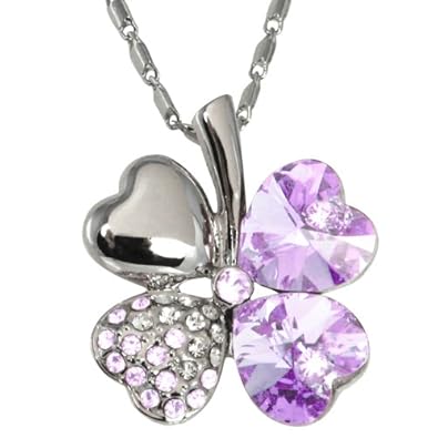 As four leaves clover symbolizes good luck, this pendant is further designed with heart shaped leaves in wishing wearer the best luck with all your heart. It makes the perfect gift in your mother, valentine, and siblings.*****This necklace is set with real Swarovski crystals which are considerably more expensive than other crystals. With patent protected facet cuts, Swarovski crystals are optimized to get one with the most brilliant. Crystals used with this pendant have far more facets than other crystals. *****Both pendant and chain are made of cooper and plated with 18K white gold to add capacity tarnish. Even when copper is a lot higher priced than other white base metals like iron, lead, nickel, zinc, etc. , it enables intricate and delicate jewelry making while some don't. *****The mirror surface with this necklace has sleek and glamorous reflections and adds a deluxe fine jewelry look. It's accomplished through intricate steps which may only be done by highly experienced workers. *****The pendant measures 0.87 inch wide and One inch high as well as the necklace is 16-18 inches long with a 2 inch adjustable chain tail. This pendant necklace is obtainable in 4 colors: Aquamarine Blue, Peridot Green, Pink Sapphire and Amethyst Purple.*This item is not really a Swarovski brand product. *****A free beautifully designed Dahlia jewelry box is protected to have an impressive gift presentation. Besides Thirty day no-question-ask return policy, Dahlia also offers Quality Guarantee to make certain your risk-free shopping experience (Restriction applies, see our website for more details). Please e mail us DIRECTLY for any defective or product feedback.