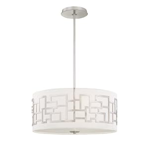 Contemporary / Modern Up Lighting 3 Light Pendant with Cylindrical Fabric Shade through the Alecia s Necklace Collection With designs reminiscent of circuitry, the Alecias Necklace 3 Light Pendant is really a fantastic way to add contemporary style and modern illumination to the room. Features: Uses (3) 100 watt Medium Base Bulbs (Not Included) Adj. To 51"H Max. Etched Diffuser Contemporary / Modern Theme Cylindrical Fabric Shade Specifications: Height: 8" Diameter: 18"
